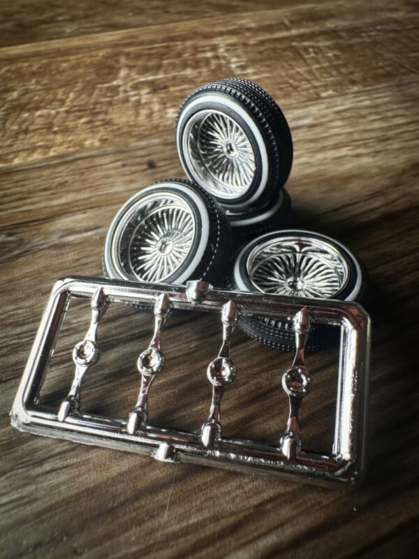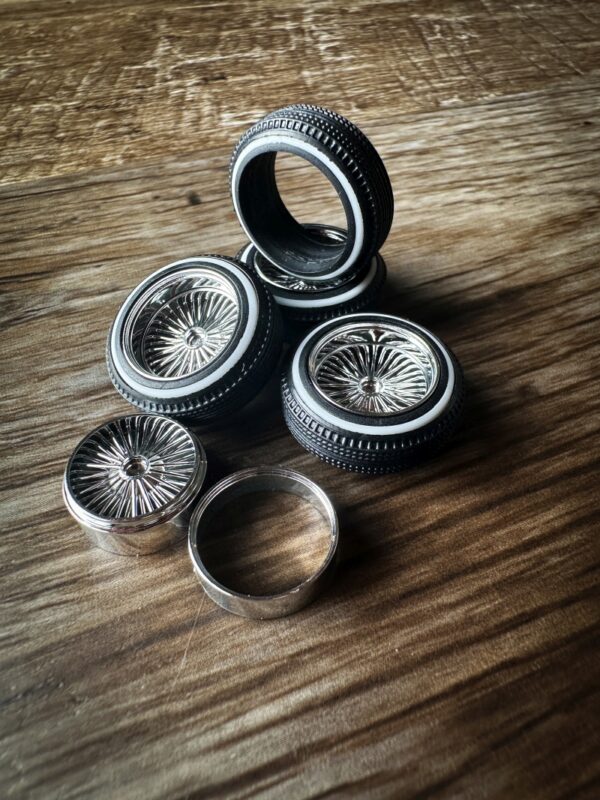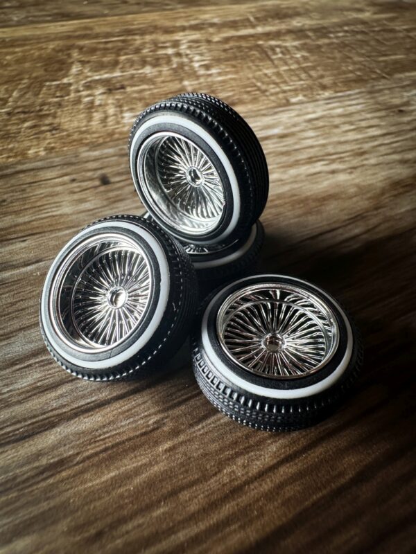 These are the two-piece DZ medium chrome rims with 420 lowrider tires. Set of 4 with knockoffs. The spokes are set back from the front edge further into the rim than the one-piece shallow DZ’s.